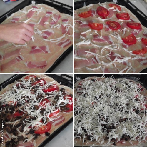 Сверху положите кусочки бекона, отваренного куриного филе, жаренные грибы, нарезанные помидоры, по желанию можно добавить зелень и конечно же обильно посыпать тертым сыром.