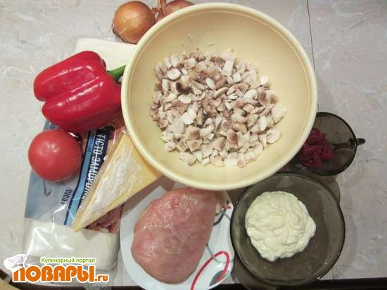 Куриное филе необходимо отварить, подождать пока остынет и нарезать небольшими кусочками. Берем болгарский перец, моем и тоже нарезаем. Твердый сыр натираем на крупной терке.