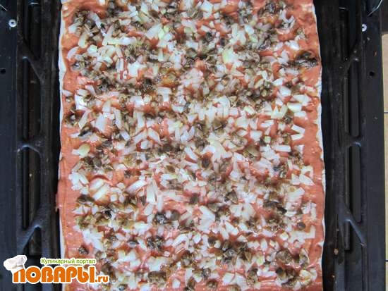 Для начала необходимо приготовить начинку. Берем грибы, чистим их и нарезаем небольшими кусочками. Чистим лук и тоже нарезаем его небольшими кусочками. Далее грибы с луком обжариваем на сковородке, добавляем соль, перец по вкусу. Жарим грибы до тех пор, пока они не будут готовы.