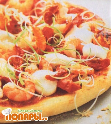Сверху разложите креветки и поставьте в духовку еще на 5-10 мин, пока пицца не станет хрустящей и румяной. Посыпьте зеленым луком, нарежьте сегментами и подавайте на стол.