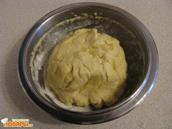 В кастрюльку или миску выливаем сливочное растопленное теплое масло, добавляем сметану (200 грамм) и высыпаем по чуть-чуть муку. Хорошо перемешиваем и ставим в холодильник 30 - 60 минут.