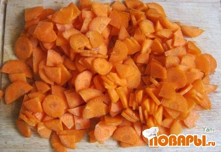 Морковь нарезаем тонкими кружочками, половинками, четвертинками (в зависимости от толщины моркови).