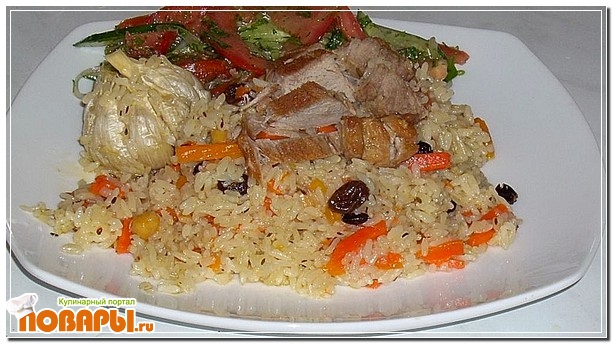Выложить рис на зирвак; сделать огонь на максимум; положить на рис изюм и часть зиры; вода должна выкипеть за 7-10 мин.; собрать рис горкой; сделать отверстия в рисе; накрыть тарелкой и крышкой казана; подождать 1 мин.; сделать огонь на минимум; оставить на 15 мин.