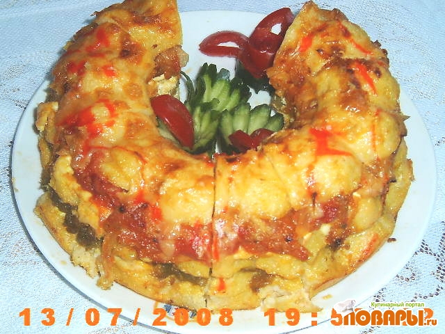 Завершаем последним корж поленты, положила на смазанную слив. маслом огнеупорную посуду (в рецепте было написано на смазанный слив.маслом пергамент)и положила в духовку. Выпекать при t=200* на 30 мин. За 10 мин. до готовности посыпала тертым голландским сыром и полила острым кетчупом.