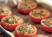 Накройте противень пергаментом, установите помидоры срезом вверх. Нафаршируйте помидоры приготовленной смесью, слегка сбрызните маслом и запекайте под максимально разогретым грилем (или в разогретой до 230 °С духовке) 5–6 мин. Подавайте теплыми.