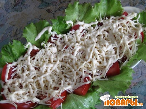 В салатницу кладем листья салата, затем укладываем помидоры, порезав пластинками до 1 см, сверху укладываем натёртый сыр и поливаем майонезом.