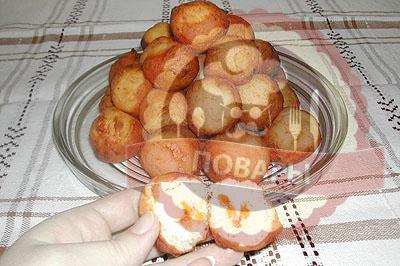 Взбить яйца с сахарным песком, добавить творог, муку, гашеную соду. Все компоненты тщательно растереть.