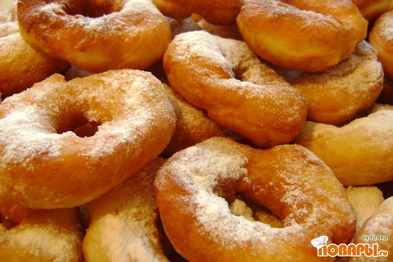 Готовые пончики посыпать сахарной пудрой