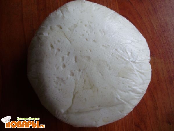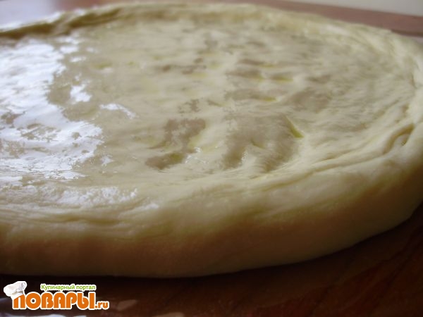 Достаем тесто, раскатываем (я растягиваю и формую руками, мне так удобнее). Толщина где-то 5-7 мм.