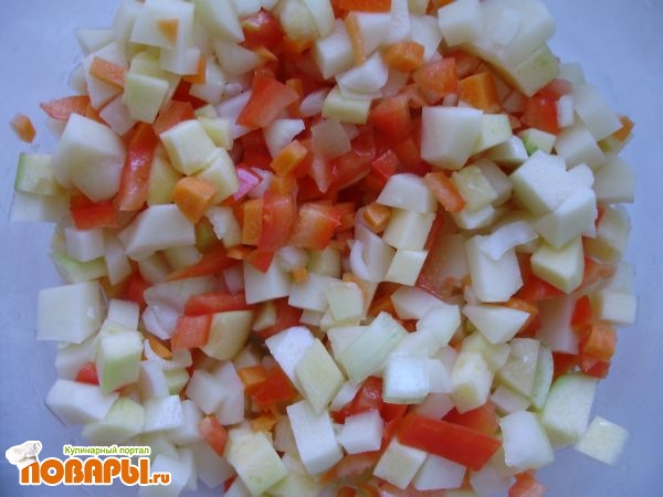 Мелкими кубиками нарезается все. Базовый набор для постных вегетарианских мант - это тыква, лук и картофель. Я предпочитаю добавлять еще болгарский перец, морковь, кабачок. Это сочнее и пикантнее.