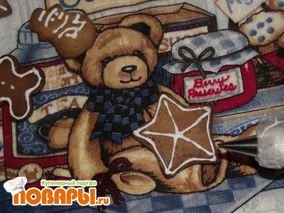 Для глазури: взбить белок с сахарной пудрой и парой капелек лимонного сока. Оставить печенье на пару часов, чтоб подсохла глазурь.