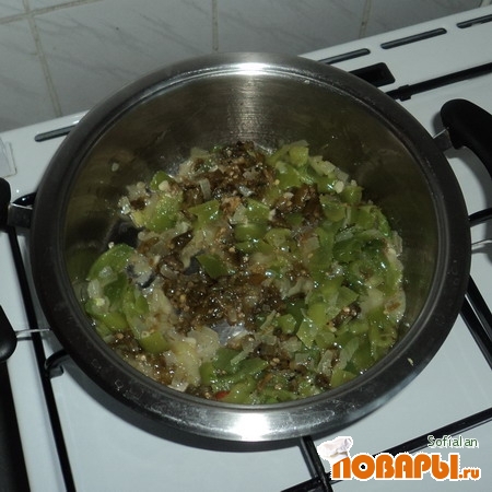 Болгарский перец очищаем от перегородок и семечек, режем на кубики. Острый зеленый перец режем кружочками. Добавляем к луку, обжариваем 3 минуты.