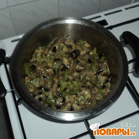 Баклажан частично очищаем от кожицы, режем некрупными кубиками, добавляем в кастрюлю, обжариваем еще 5 минут.