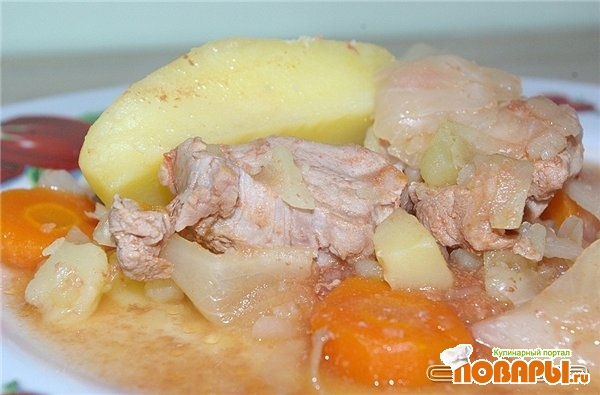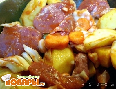Свинину нарезать кусочками, как нравится. Картофель, морковь, лук, также по-вкусу. Посолить, добавить томатную пасту, залить кипятком, чтобы покрыло продукты. Перемешать.
