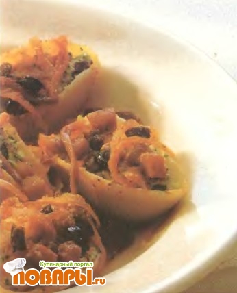 Начинить ракушки смесью с брокколи, затем разложить их одним слоем на большом, смазанном маслом огнеупорном блюде. Полить сверху соусом капоната и посыпать оставшимся сыром.
