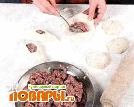 Положить на середину каждой лепешки фарш и защипать края таким образом, чтобы осталось отверстие.