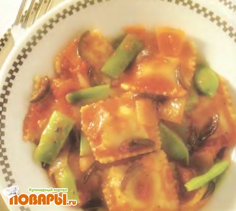 Отварить равиоли и добавить фасоль в последние 5 минут приготовления. Воду слить.