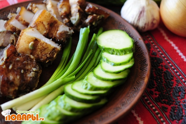 Затем сало вытащить из сковороды, подготовить для него удобную посуду. Сало нужно обмазать чесноком, пропущенным через чеснокадавку или мелко порубленным.