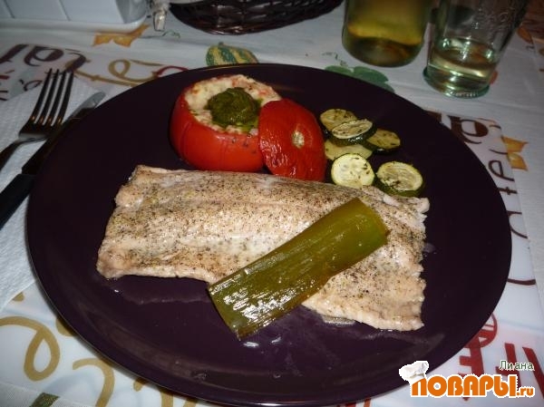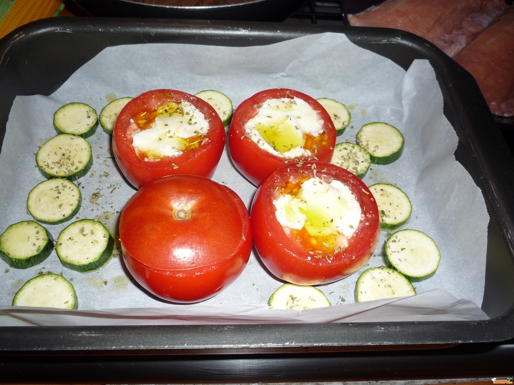 Вокруг можешь разложить кружки кабачков или другие овощи. Запекай помидорчики на противне при температуре 180-200 градусов минут 45-60. Готовые помидоры выложи на блюдо, сними крышечки, положи в каждый по ложке соуса «Песто». Вокруг разложи ломтики моцареллы и веточки базилика. Либо подай, как гарнир, к рыбе, мясу.