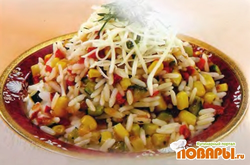 Рис промойте сначала в холодной, затем в горячей воде, залейте овощным отваром и варите на слабом огне 15-20 минут. Затем добавьте овощи, мелко рубленные душицу и базилик, посолите и поперчите. В готовое блюдо добавьте сыр, перемешайте.