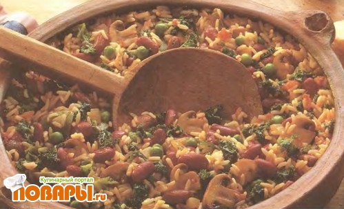 Добавить шпинат, горошек и фасоль, перемешать, накрыть крышкой и потушить еще 5-10 минут, пока бульон не впитается. Выложить на блюдо и подать к столу с белым хлебом.