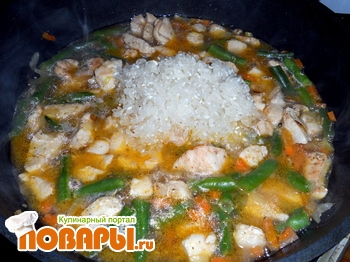 Посолить и посыпать специями. Всыпать рис (хорошо промытый). Налить воды или бульона, чтобы жидкость была немного выше риса.