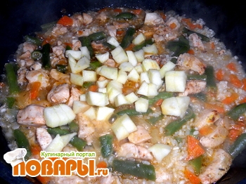 Если фасоль свежая - порезать на кусочки. Обжарить ее вместе с морковью, белым луком и мясом на масле.