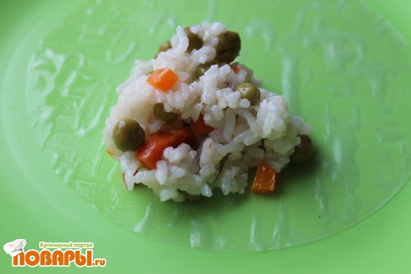 Бумагу рисовую замачиваем каждый лист отдельно секунд по 15-20, достаем, стряхиваем лишнюю воду, кладем на плоскую тарелку, лист станет очень гибким и липким.
