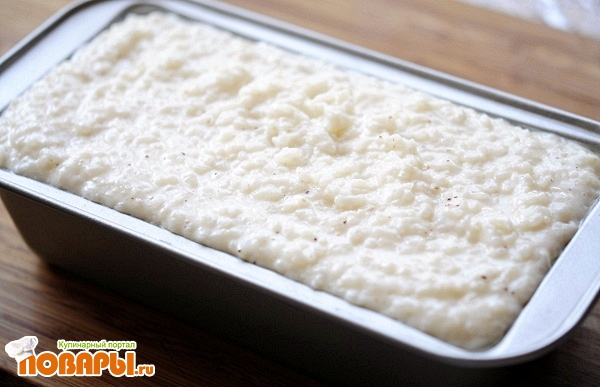 Теперь самое время переложить рис, в заранее обмазанную формочку маслом. Убираем в сторонку чтобы остыло, а затем в холодильник до полного остывания и даже до замерзания.