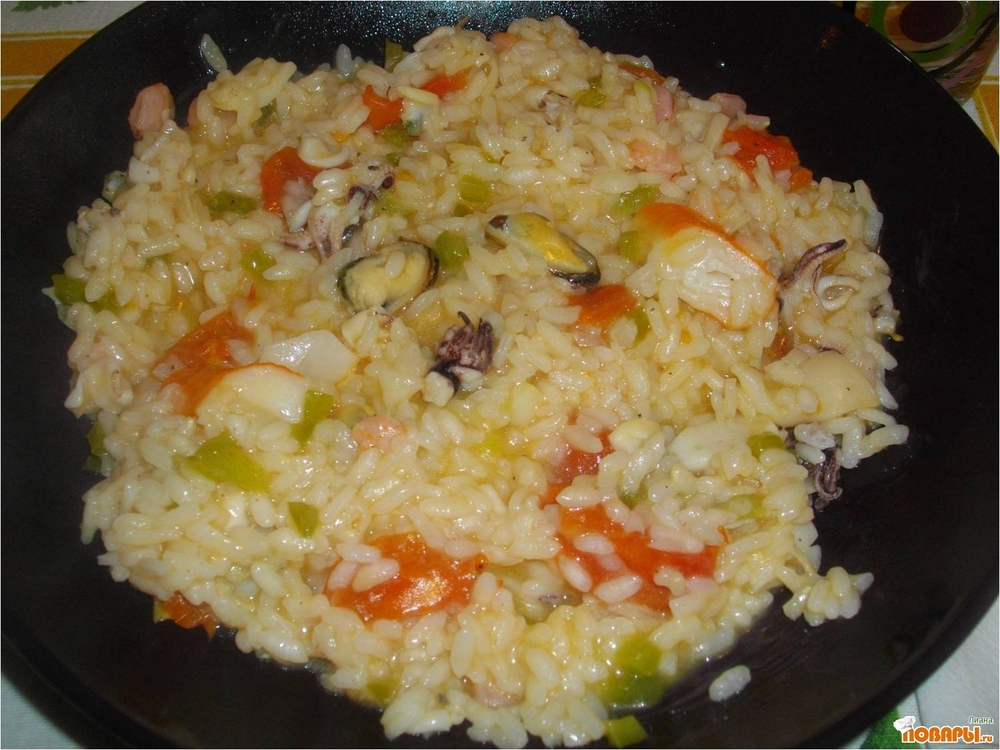 Затем всыпать перец (кубики), помидоры (на четыре части), посолить, поперчить. Держать на огне пару минут. Теперь всыпать морепродукты, влить вино и держать на огне до готовности. В процессе приготовления крышкой не накрывать. Сразу разложить по тарелкам, посыпать тертым пармезаном и подать.