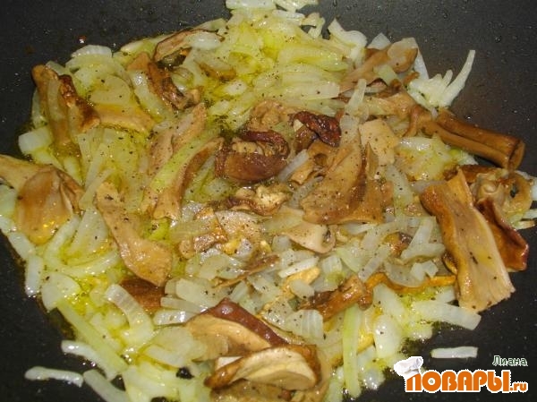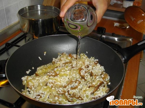 В литре теплой воды замочить на полчаса сушеные грибы. Отжать. Воду процедить и вскипятить, держать на слабом огне. Рис промыть хорошо под проточной водой, откинуть на дуршлаг. В оливковом масле довести до прозрачности порубленную соломкой луковицу. Всыпать грибы.