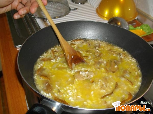 Теперь добавляйте отвар грибной по половнику, делайте огонь сильный и мешайте все время. Добавляйте отвар по мере его выпаривания.