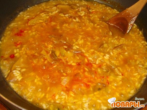За 5 минут до готовности всыпьте шафран, соль, поперчите и доведите рис до готовности. В отличии от нашего рассыпчатого плова, ризотто должно получится немного вязким, но рисинки не переваривайте, альденте, как в пасте.