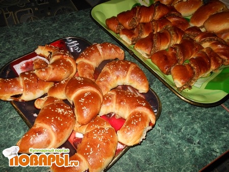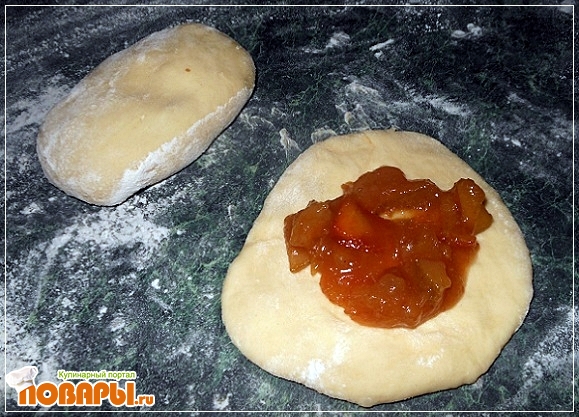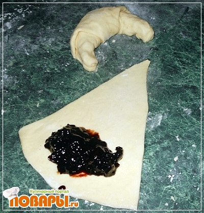 Из готового теста вылепить пирожки с вареньем яблочно- грушовым, рогалики с вишневым вареньем и булочки с ореховой начинкой.