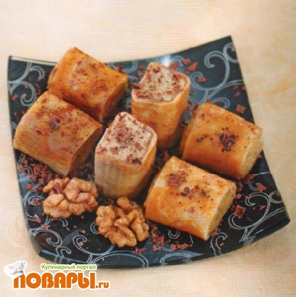 Ореховую массу ровным слоем нанести на блин, свернуть его в рулет.