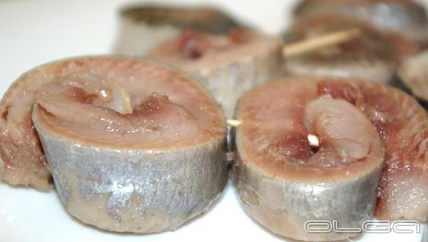 Селедки очистить, разделить на филе. Каждое филе разрезать вдоль на 3 части. Свернуть рулетиками, сколоть шпажками