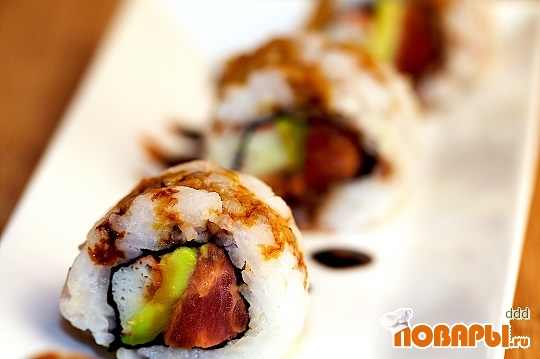 Используйте большую ложку, чтобы отделить авокадо от жесткой кожи, стараясь сохранить авокадо целым. Нарезать на ломтики авокадо. Нарезать тунец на шесть длинных кусочков. На рис выливаем майонез и соус Срирача. И наконец в центр всего это кладем авакадо,тунец, крабовое мясо и угорь Получаем удовольствие!