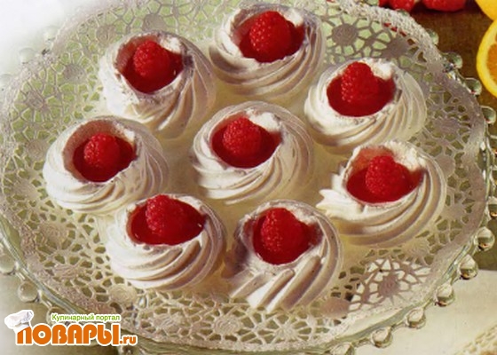 Поместите клубничный джем в кастрюльку, добавьте апельсиновый ликер и слегка проварите. Украсьте каждое безе, налив в углубление чайную ложку джема и поместив сверху ягоду малины.