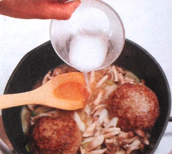 В миску положить муку, сбрызнуть сакэ и перемешать, встряхивая. Добавить фарш, сакэ, яйцо и соль(список А), вручную смешать все и замешать до липкого загустения.