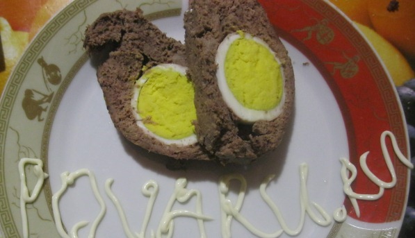 Получившийся фарш посолить, поперчить, добавить специи и добавить половину взбитого яйца. Хорошо перемешать. Распределить по фольге, положить сверху очищенные вареные яйца. Скатать рулет.