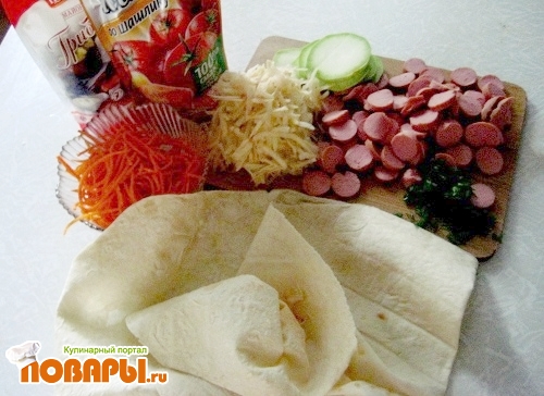 Лаваш смазать майонезом и равномерно разместить по нему тертый картофель, сверху резанную кольцами колбасу и кабачок.