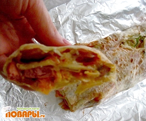 Присыпать всё зеленью. Затем ровным слоем разложить корейскую морковь и обильно полить майонезом и кетчупом. Свернуть всё в рулет.