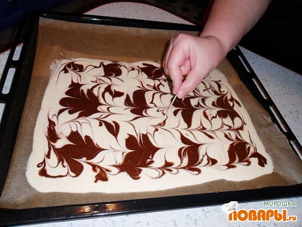 Противень выстелить пекарской бумагой.Тесто равномерно распределить по ней.Шоколадное тесто хаотично распределить по белому тесту.Взять зубочистку или спичку,и провести по тесту вдоль и поперек.