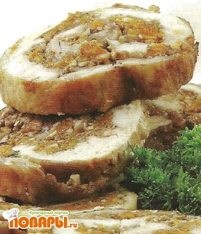 Разложите начинку на ломтики птицы, сформуйте рулет.