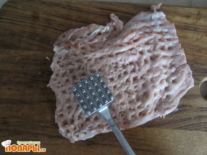 В первую очередь берем свинину и разрезаем ее на пополам так, чтобы получилось два пласта. Берем один кусок и хорошенько отбываем его с помощью молоточка с двух сторон.