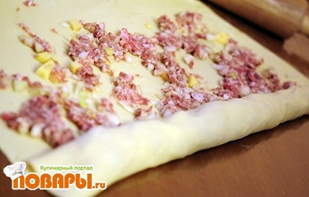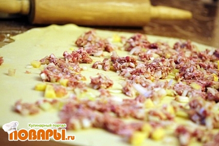 Теперь можно выкладывать начинку. Тонким слоям по всей поверхности нашего раскатанного теста и даже максимально по краям.