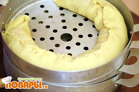 Тесто раскатать большой лепешкой, максимально тонко. Далее я бы посоветовала смазать подсолнечным маслом, так будет вкуснее, за счет того что масло будет отталкивать сок из выделяемый луком и тыквой, и не давать проникать в тесто.