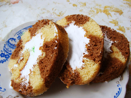 Выливаем белое тесто, а из шоколадного наносим полосы.