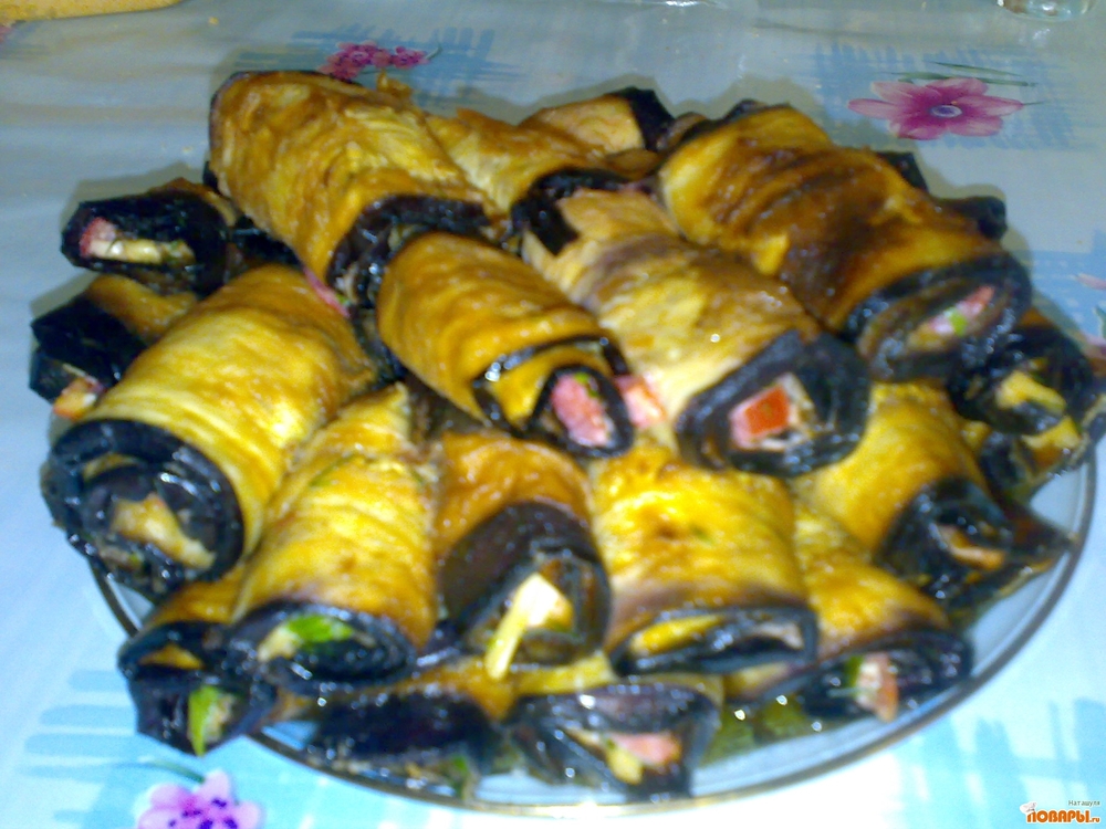 На полосочки баклажанов положить чайную ложку начинки и завернуть рулетиком.