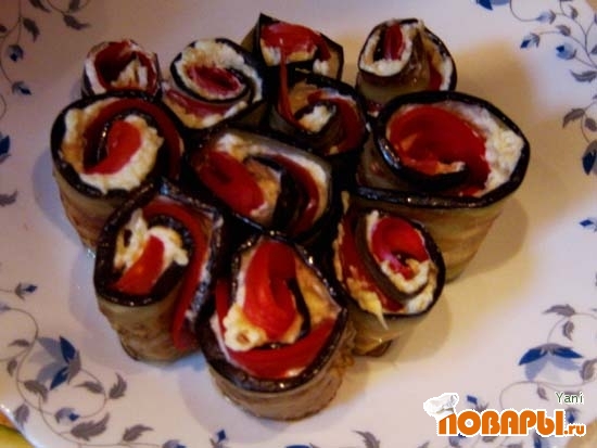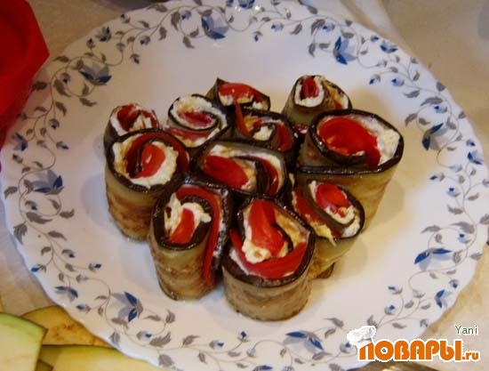Рулетики из баклажанов с сыром, чесноком и помидорами